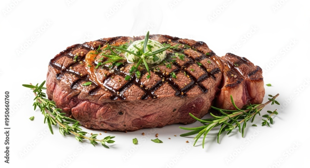 Juicy grilled ribeye steak with herb butter and fresh rosemary garnish on white background #1950660760