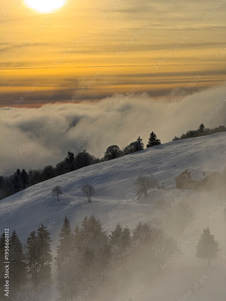 Jura mountains winter landscape with sun setting above clouds, jura; france #1958660112
