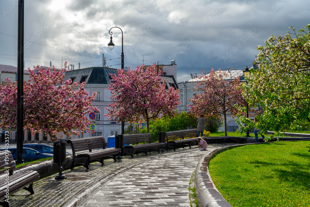 Khitrovskaya Square with blooming spring trees in Moscow, Russia. Cozy cityscape of Moscow. Architecture and landmarks of Moscow. #1909453573