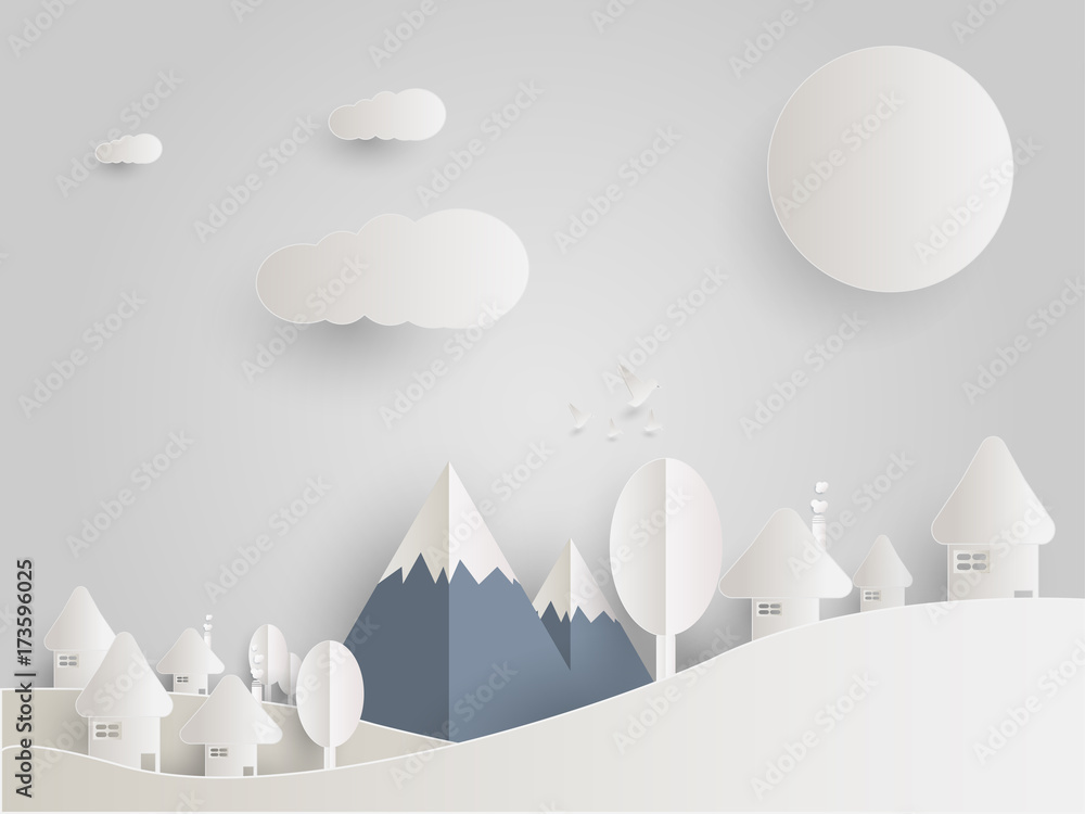 Landscape city of mushroom houses on sun day in winter, sky with cloud Stars and mountains, paper art style. #173596025