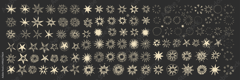 Large set of hand drawn starburst and sparkle icons arranged in rows on dark background. Vintage celestial doodle elements collection. Decorative star shapes and bursts illustration set. Vector #1956279634