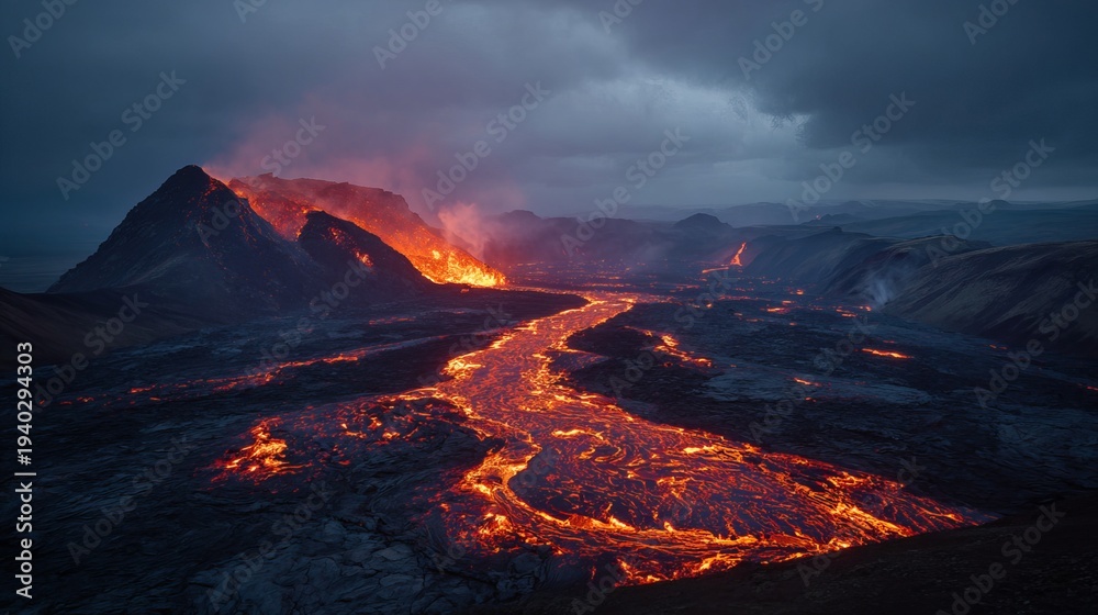Lava in Iceland's Fagradalsfjall volcano presents a beautiful sight against a cloudy sky. #1940294303