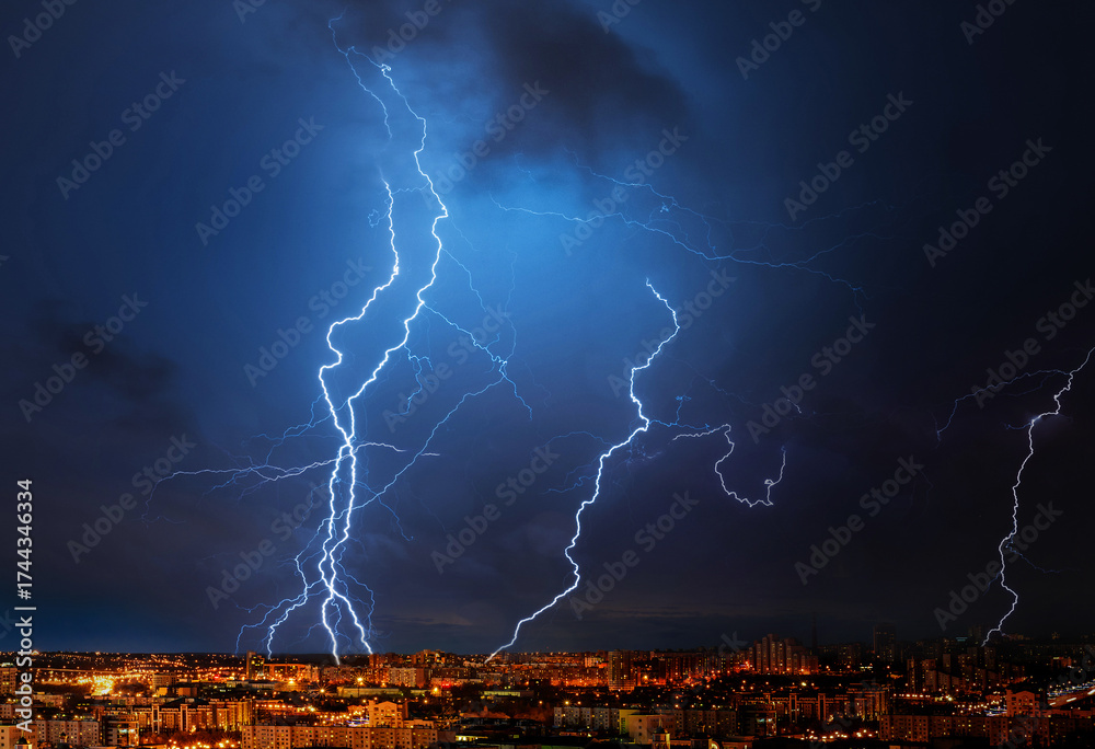 Lightning discharges in the evening sky over the city. Image on the topic of weather, natural phenomena, etc. #1744346334