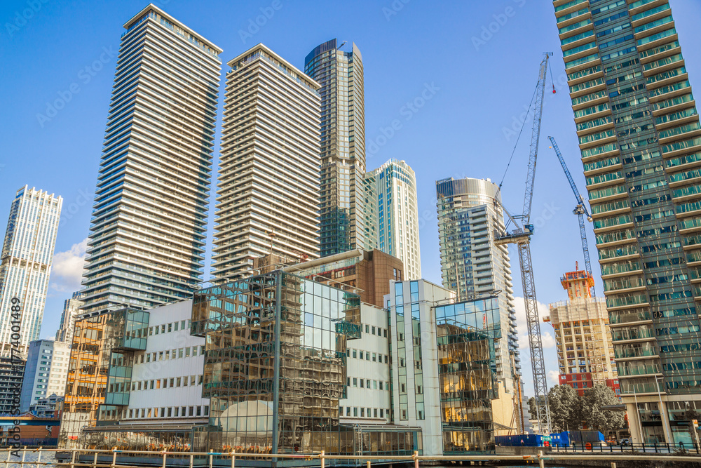 London, Canary Wharf, South dock view at sunset. New residential development#1774001489