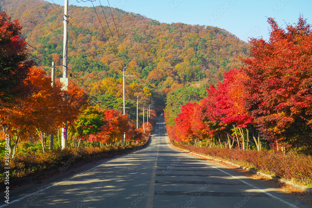 Long way road with Colourful red and yellow maple leafe,moutain during autumn in South Korea,Maple red background.. #289145682