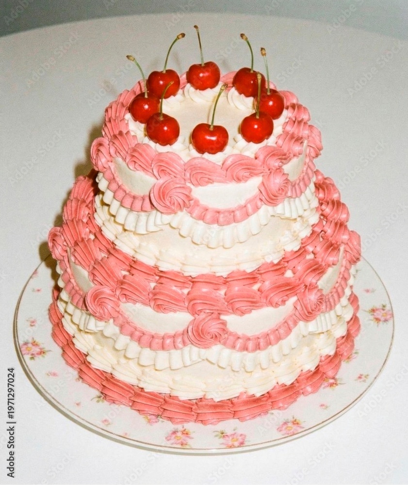 Luxury Classic Cake with Pink White Ruffles and Cherries#1971297024