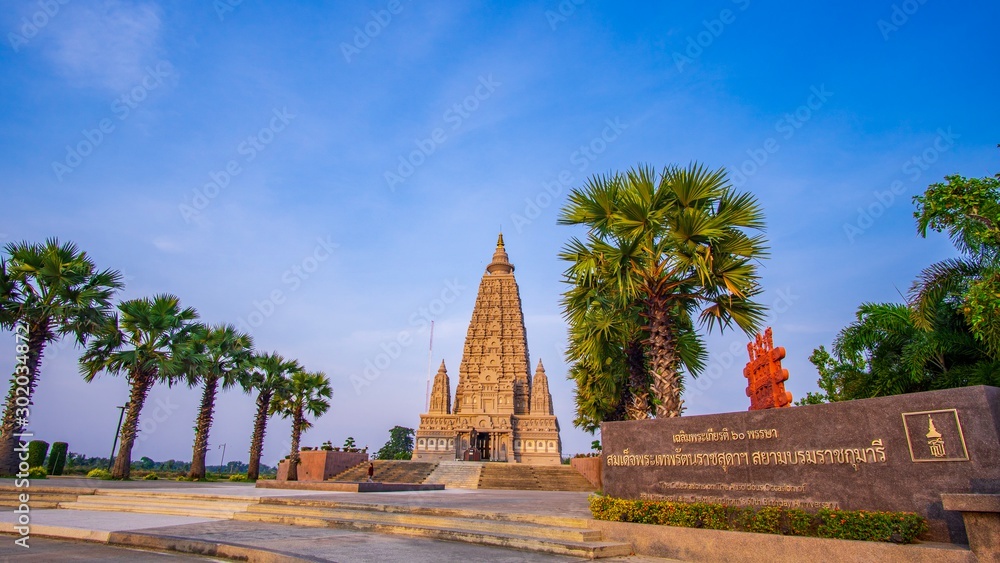 Mahabodhi Temple or Bodh Gaya Pagoda at Wat-Panyanantaram sunrise and beautiful sky, Wat Panyanantaram is famous pagoda and popular for traveler near bangkok at Pathum Thani, Thailand #302034872