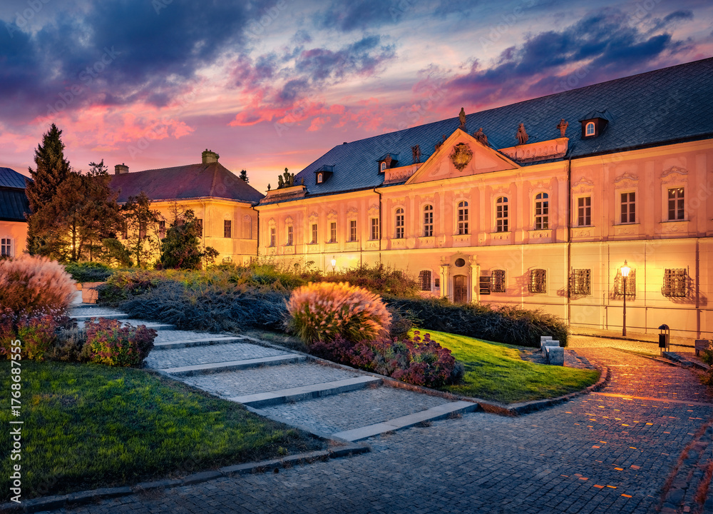 Majestic autumn sunrise in Nitra town, Slovakia, Europe. Illuminated morning scene of Seminary of St. Gorazd, western Slovakia. Traveling concept background. #1768687555