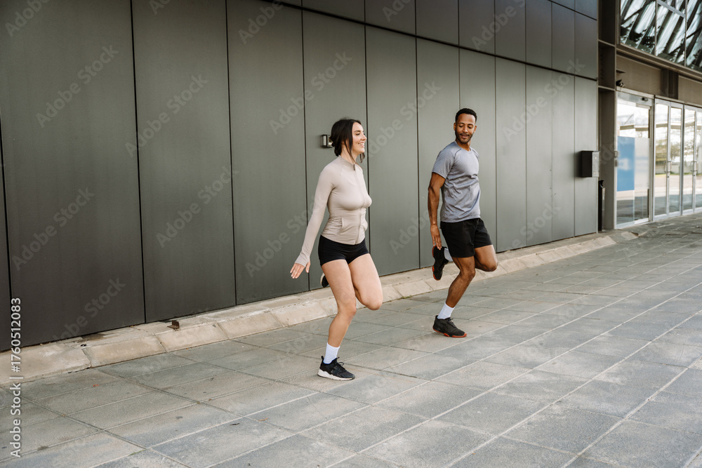 Male and female athletes running in place with legs thrown back while she smiles #1760512083
