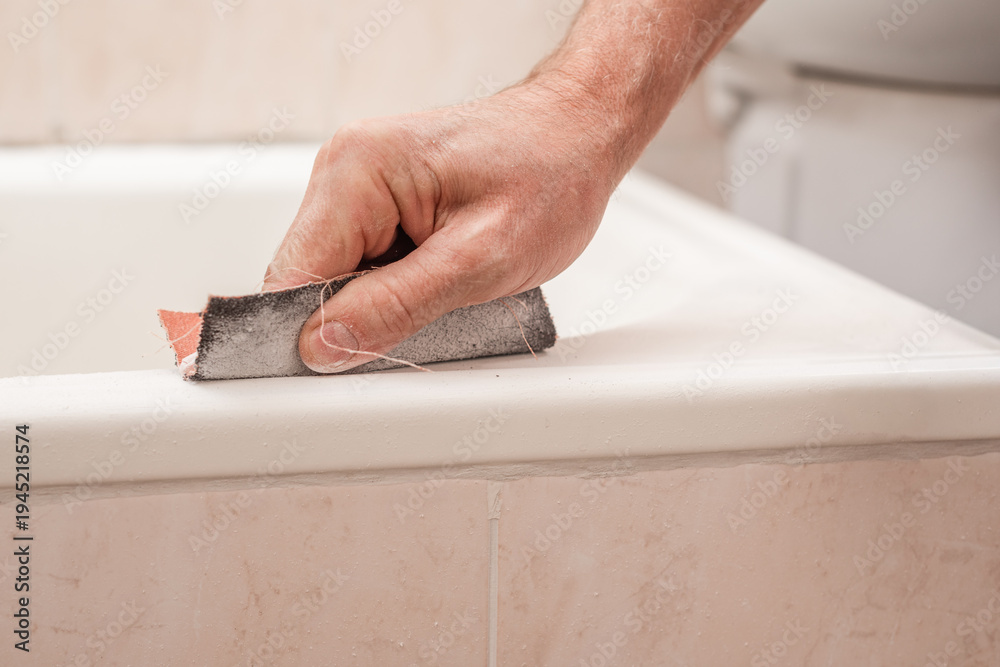 Male worker polishing bath enamel surface with sandpaper, closeup photo. Hand sanding bathtub surface before applying new finish #1945218574