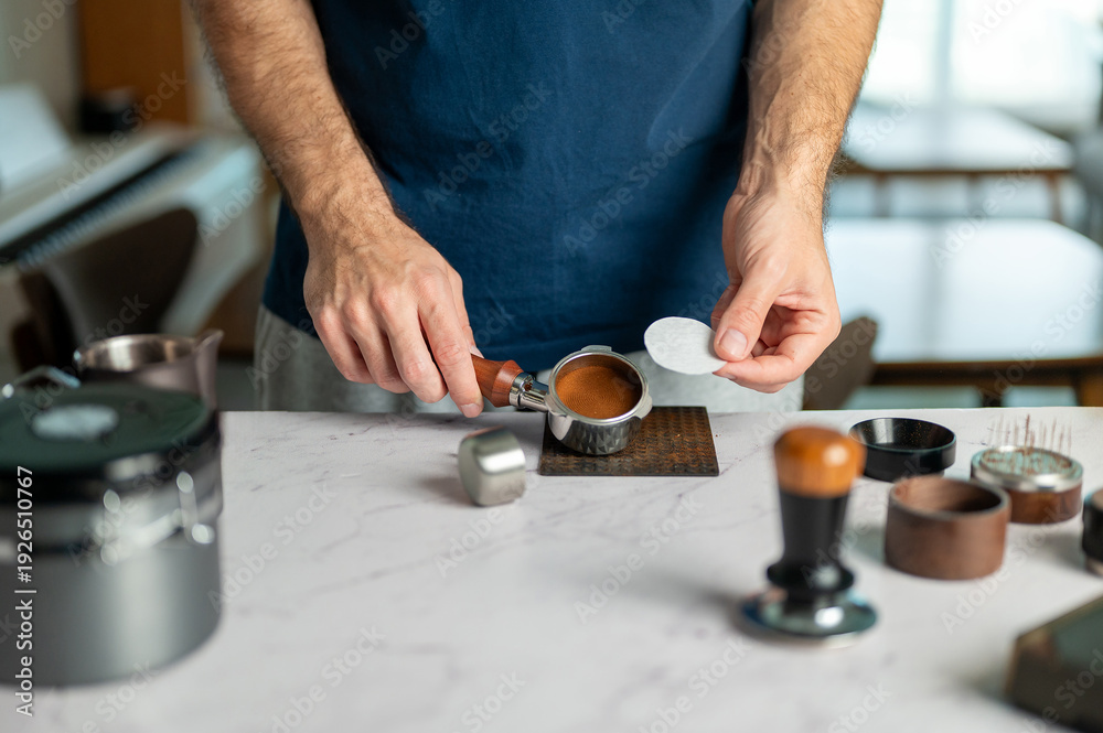 Man Preparing Espresso With Precision At Home Barista Setup #1926510767