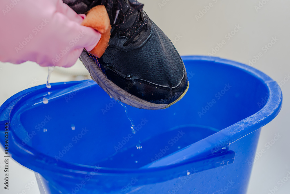 Man with gloves cleaning stylish sneakers in bucket, closeup photo. Washing sneaker with sponge over blue bucket, cleaning footwear at home #1806144565