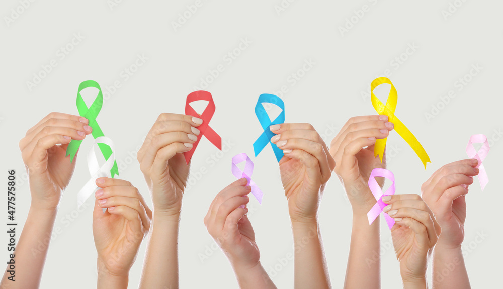 Many hands holding different ribbons on grey background. World Cancer Day #477575806