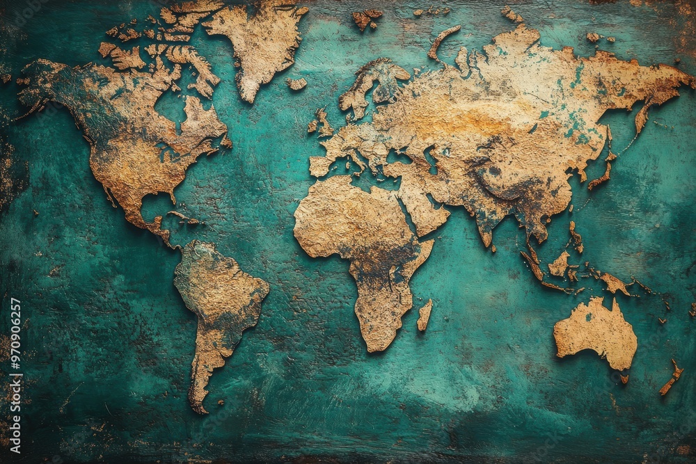 Mapa mundi de la tierra en color beige y el mar en color turquesa. Turismo y viaje. Mapa de la Tierra. #970906257