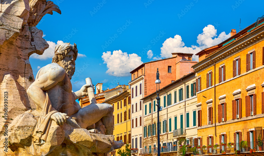 Marble sculpture of the Ganges River God at the Fountain of the Four Rivers in Rome, Italy. Historic Italian architecture and colorful buildings under a bright blue sky. #1968939213