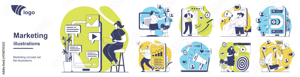 Marketing concept set for web design. Collection with people chatting and posting in blogs, attracting new customers, doing advertising campaigns, targeting and e-commerce. Vector illustration. #1768755325