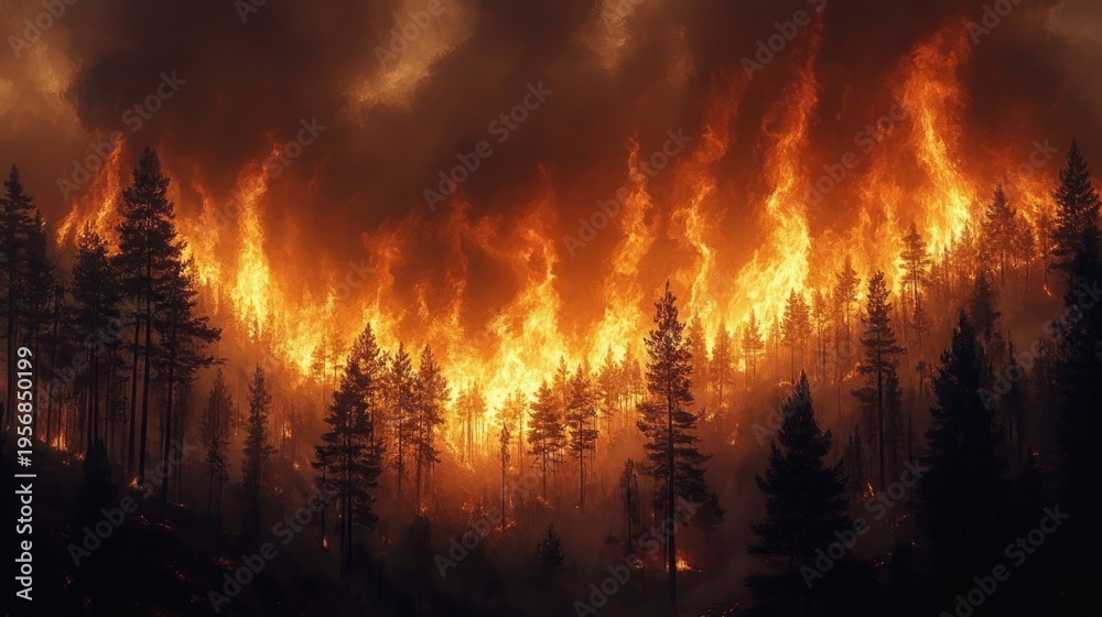 massive forest fire consuming tall pine trees with towering orange flames and thick smoke, a terrifying scene of destruction and urgency #1956850199