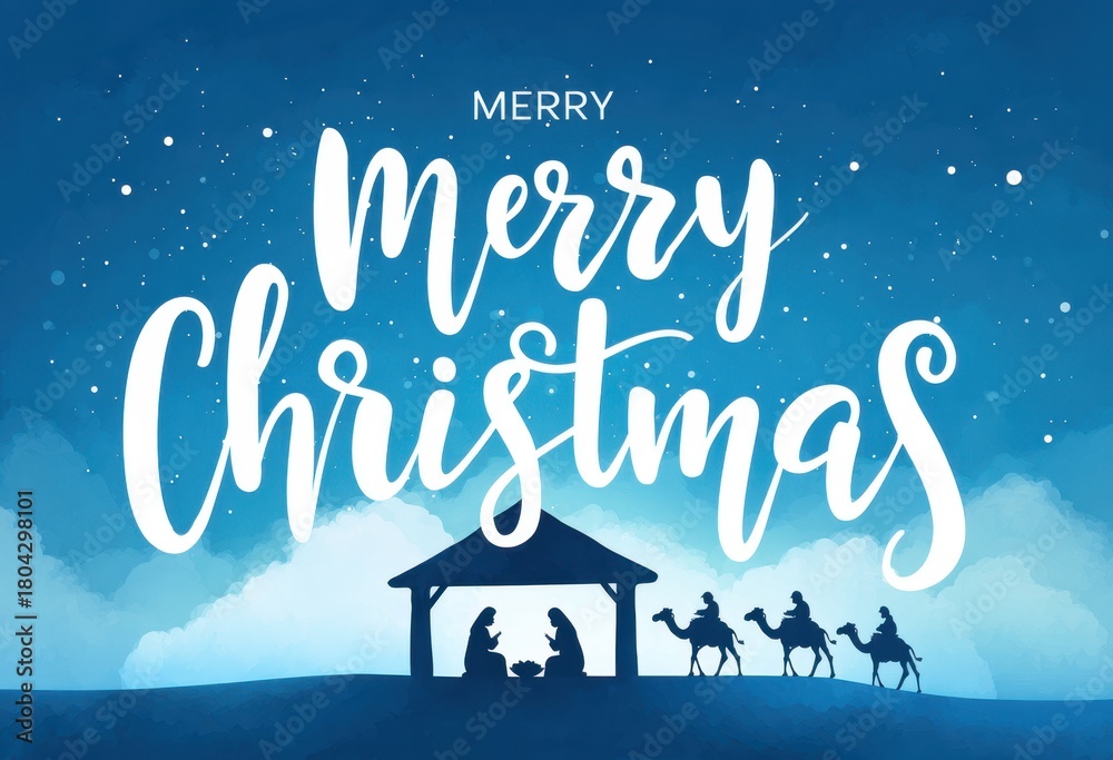 Merry Christmas Nativity Scene Illustration With Three Wise Men And Starry Sky For Holiday Greetings #1804298101
