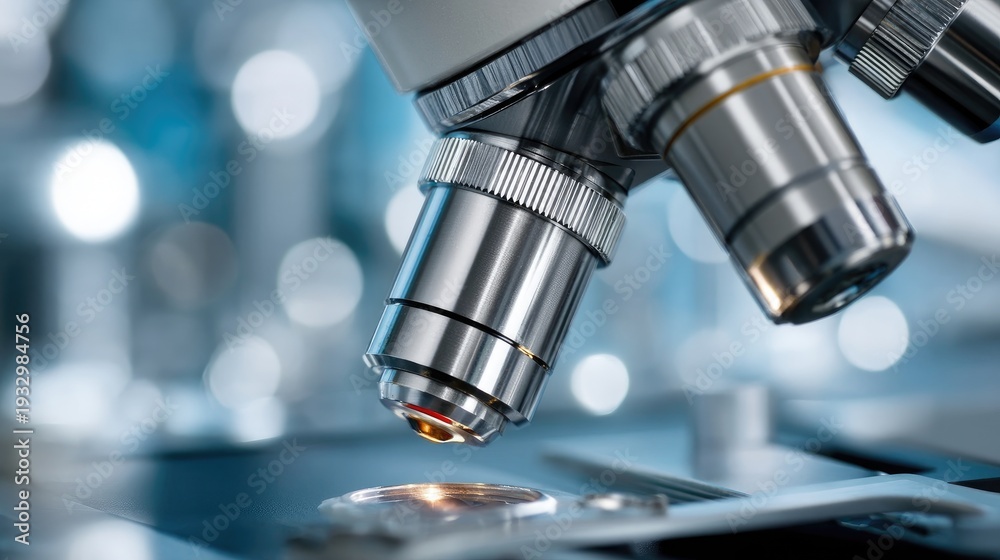 Microscope sits in a laboratory with a focus on its lenses and stage, highlighting the scientific equipment used for research and study #1932984756