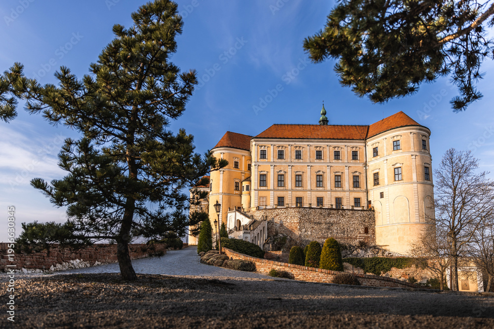 • #1956637647 Mikulov Castle in South Moravia, Czech Republic, captured during spring in sunny weather. Scenic historic architecture with clear sky and warm daylight