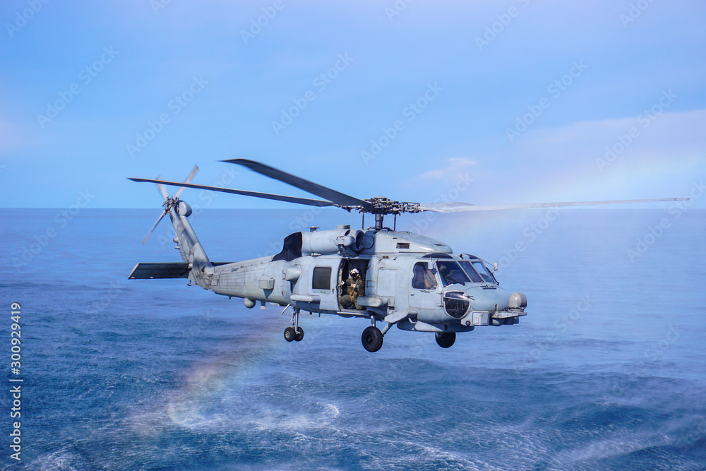 Military navy helicopter flying above the ocean.Copy space and background. #300929419