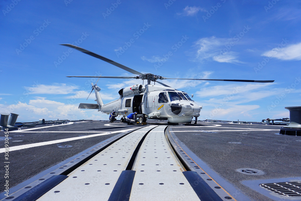 Military navy helicopter flying above the ocean.Copy space and background. #300930454