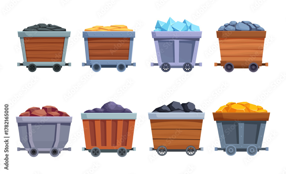 Mine carts. Isolated cart with gems, golden bars, coal and stones. Various dwarf treasures, coal and precious metal mining. Industrial sapid vector set #1782165000