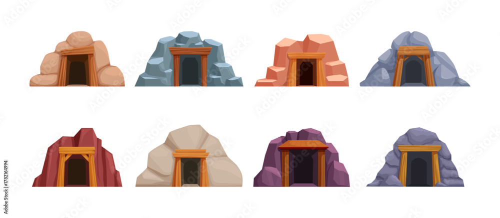 Mine entrances in mountains. Entrance openings with wooden arches, fortifications against falling rocks. Cartoon tunnels caverns or caves, sapid vector set #1782164994