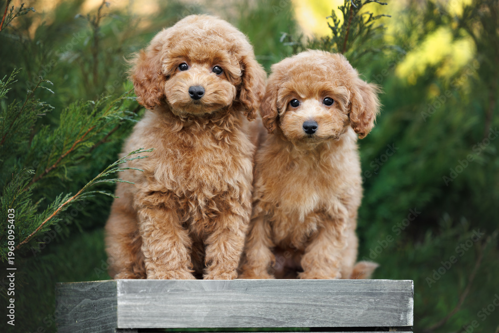 miniature and toy poodle puppies sitting together outdoors #1968095403