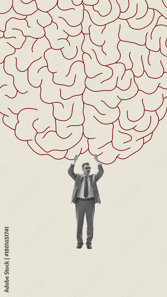 Minimal composition of businessman holding giant red brain outline with emotional strain. Concept of thinking overload, pressure, responsibility and mental work. #1801651741