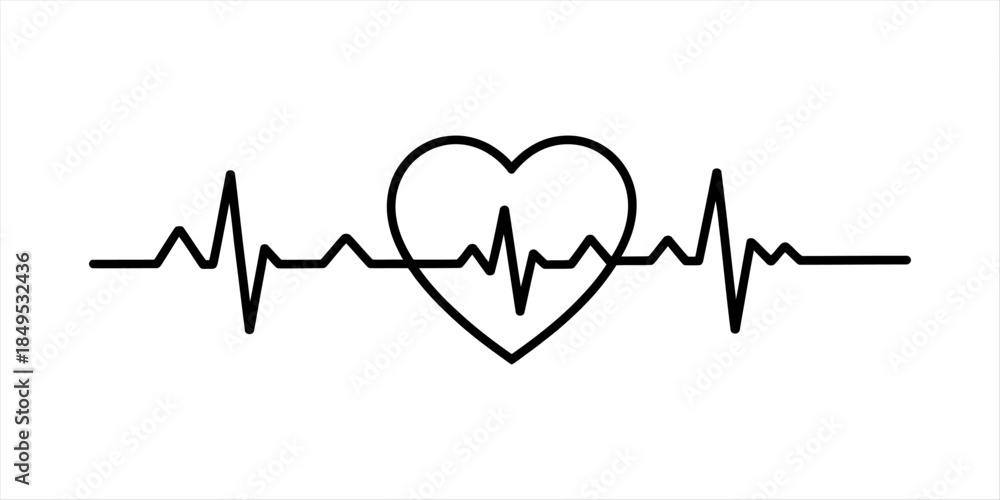 Minimalist design of an ekg heartbeat pulse line with a heart symbol in the center Vector, illustration #1849532436