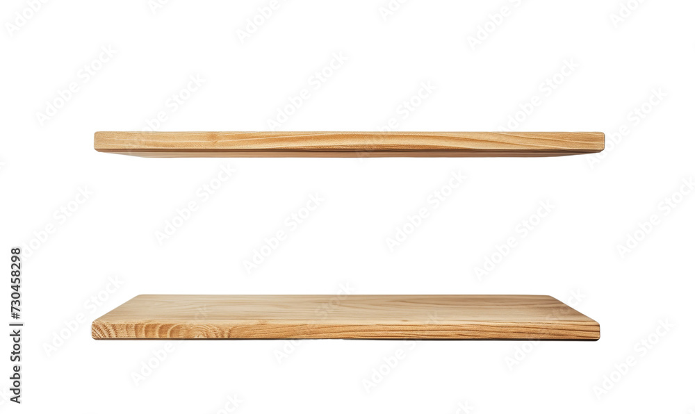 Minimalist floating wooden shelves on a clean white wall. #730458298