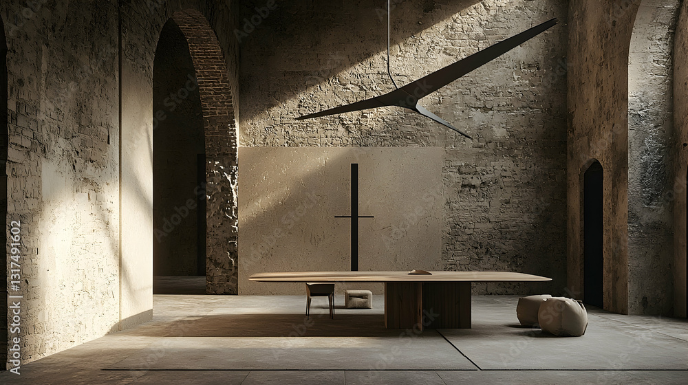 Minimalist wooden table in a stone chapel interior, sunlit, peaceful background, perfect for design or meditation imagery #1317491602