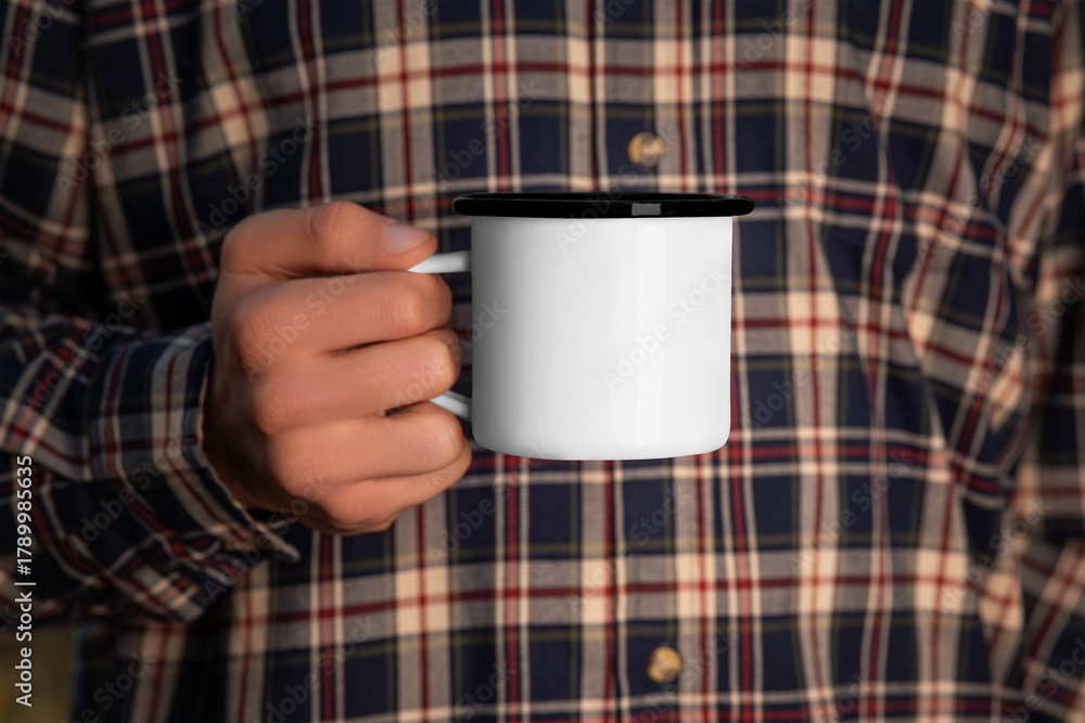 Mockup of a white metal mug with a black rim in the hand of a man in a flannel shirt. #1789985635