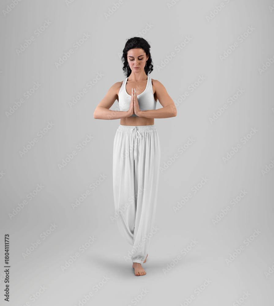 Mockup of white sports suit for yoga on trainer, wide pants, top, front view, isolated on background. #1804111773