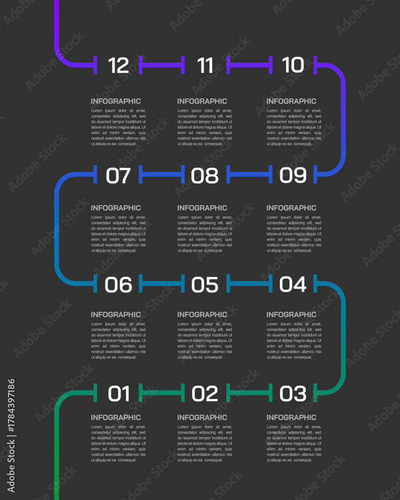 Modern Business Vertical Timeline Infographic Template with 12 Steps on Dark Background. Vector illustration. #1784397186