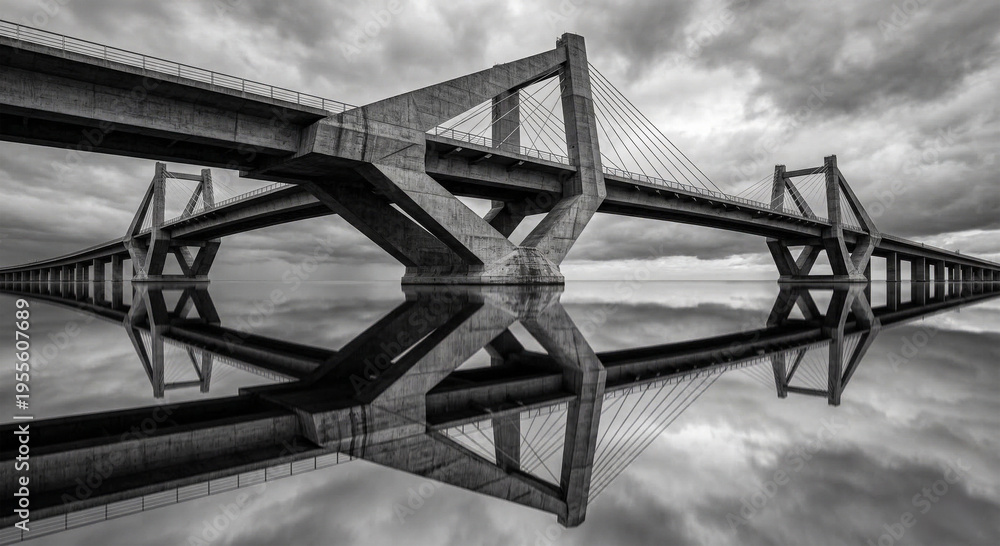 Modern Concrete Bridge with Perfect Reflection and Dramatic Sky, Infrastructure Architecture Background #1955607689