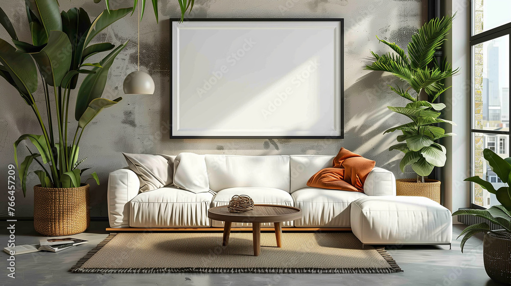 Modern living room, Horizontal frame mockup, Blank artwork frame mockup on white room wall, Wooden one horizontal frame mockup on wooden cupboard, Blank picture frame mockup on a wall, Ai #766457209