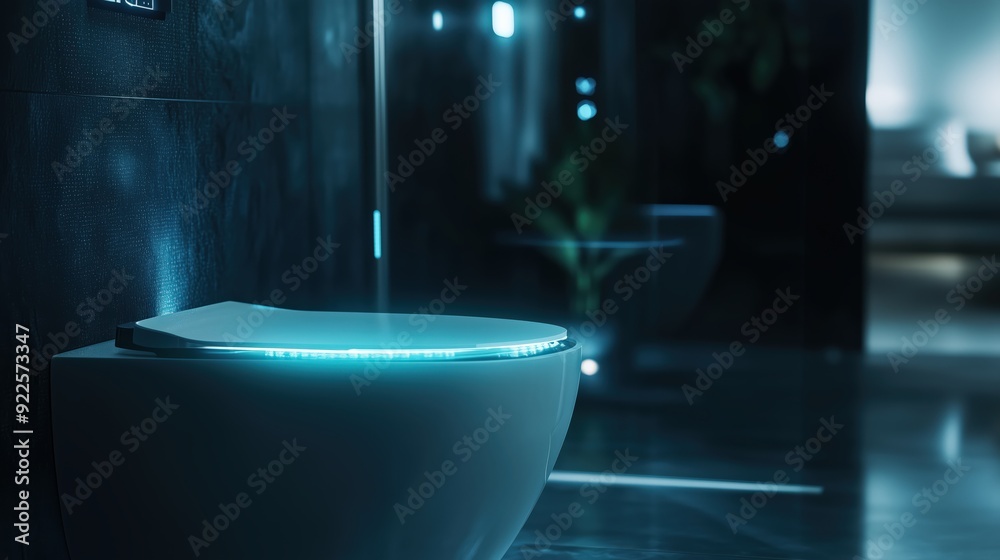 Modern smart toilet with advanced features: self-cleaning, heated seat, bidet function, controllable via an app or AI, set in a sleek bathroom environment. #922573347