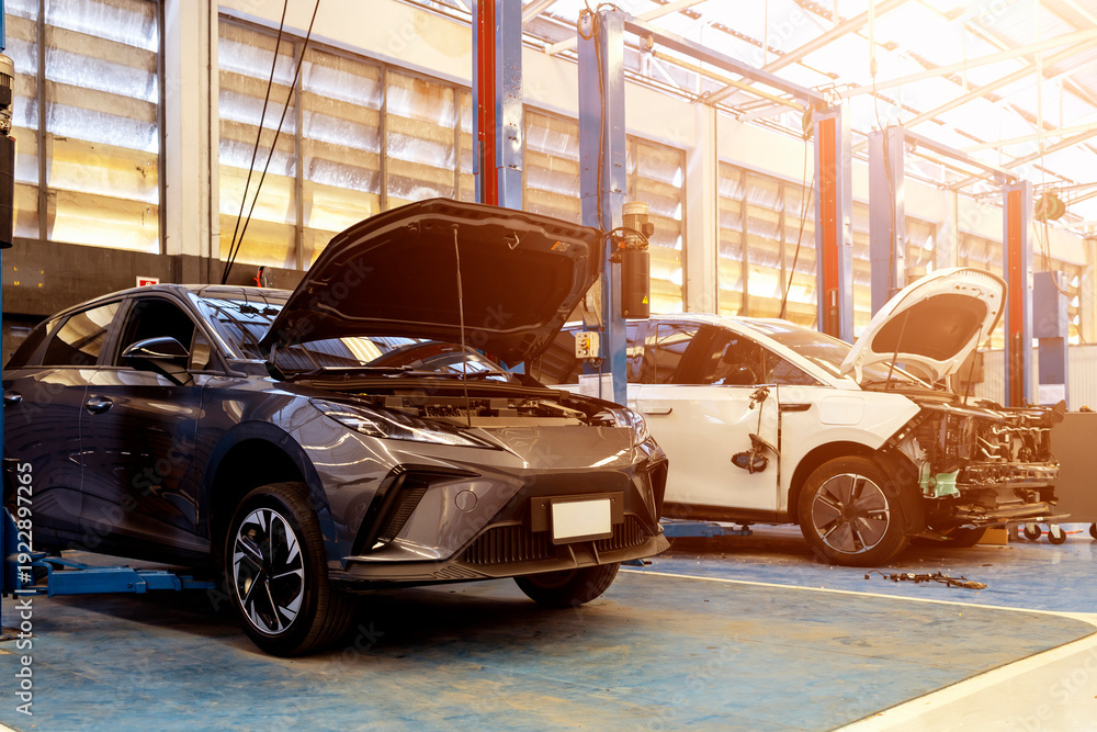 Modern white electric vehicle with side damage in a professional repair service center. #1922897265