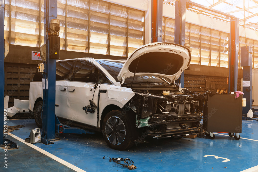 Modern white electric vehicle with side damage in a professional repair service center. #1922897388
