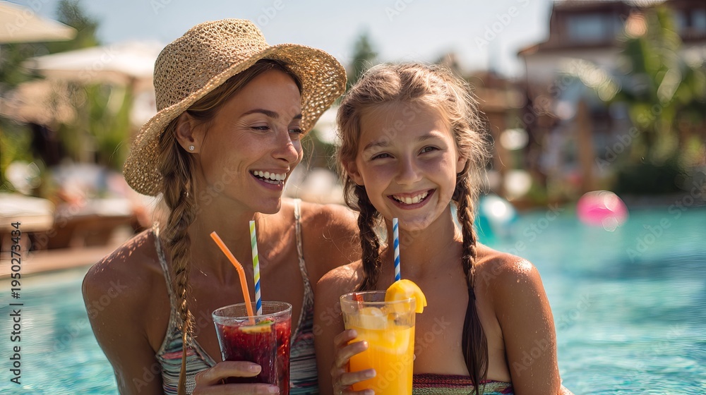 Mom and her daughter enjoy healthy drinks by the pool. It's a relaxing summer break. #1950273434