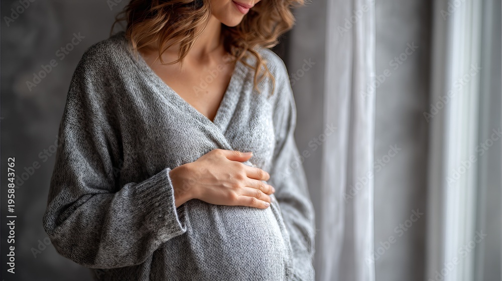 Mom-to-be gently holds her belly at home. Her comfy clothes show she's ready for new life and taking good care of her baby. #1958843762