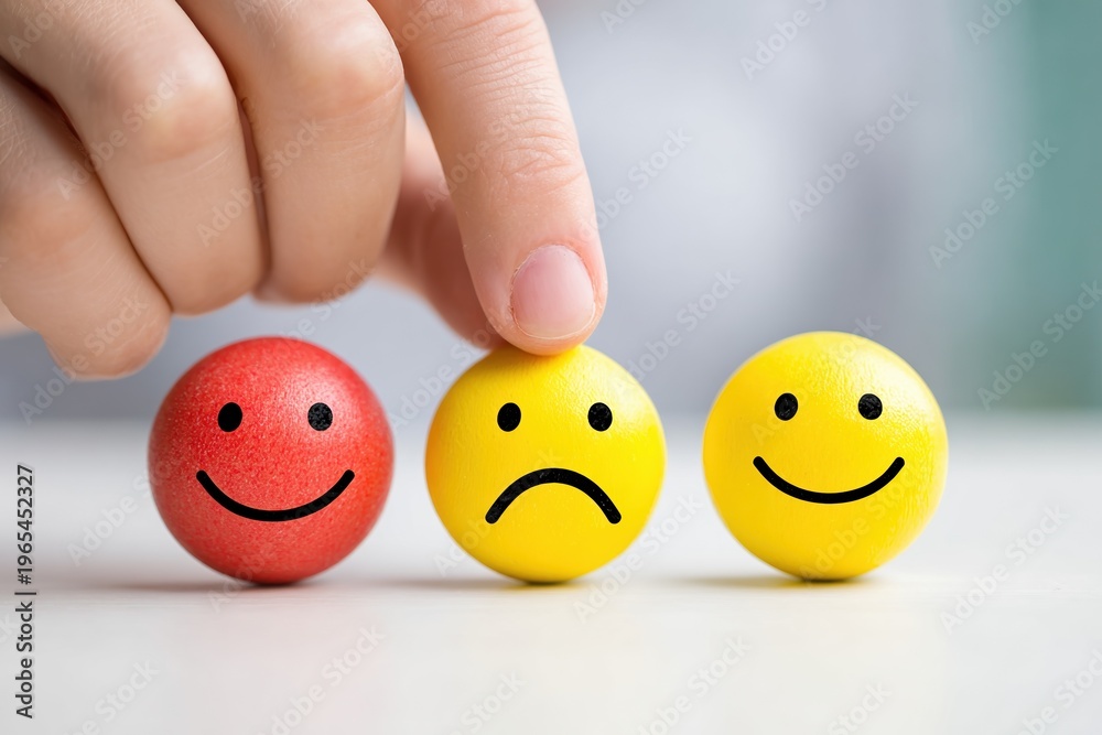 Mood Swings And Emotional Wellbeing Hand Choosing Sad Between Happy Faces Mental Health Awareness And Support Emotional Intelligence Concept, sadness, happiness, choice, face #1965452327