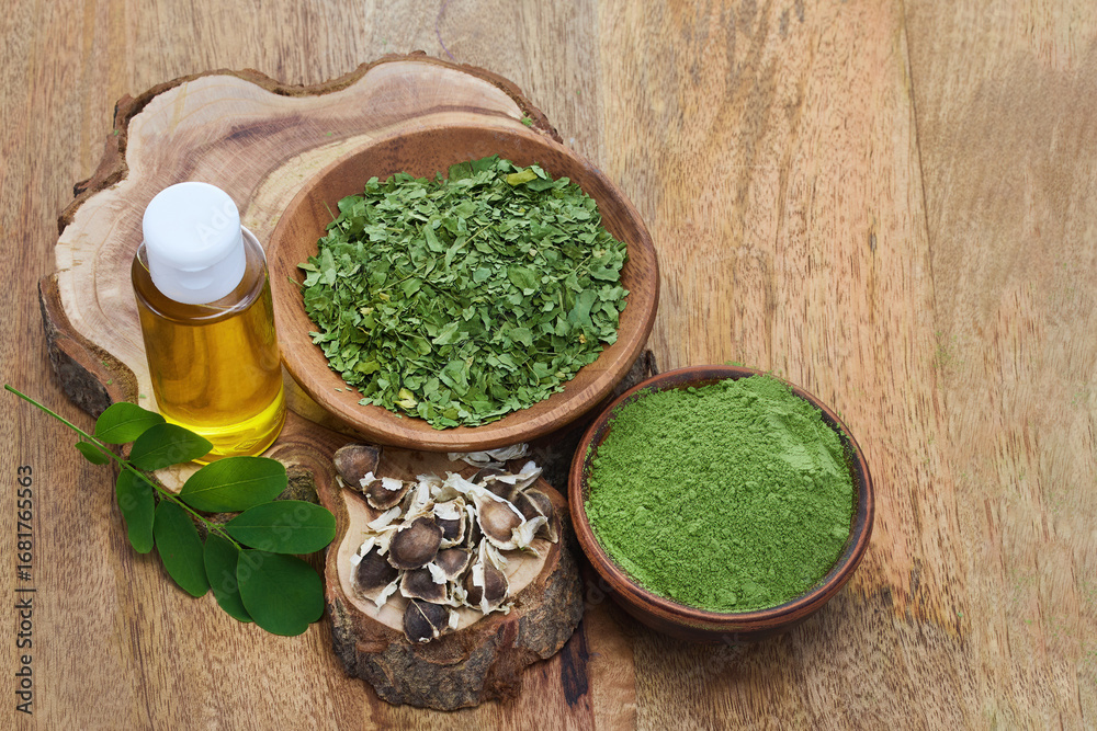Moringa Products Display on wooden background #1681765563