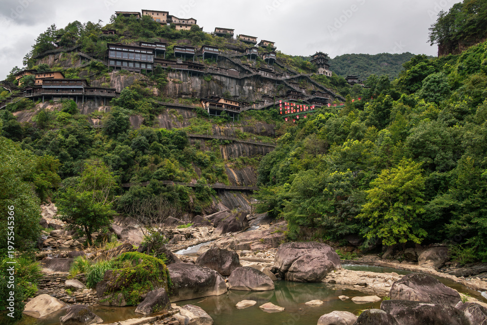 Mountain village along a rocky river gorge in Wangxian Valley, Shangrao, Jiangxi, China #1975545366