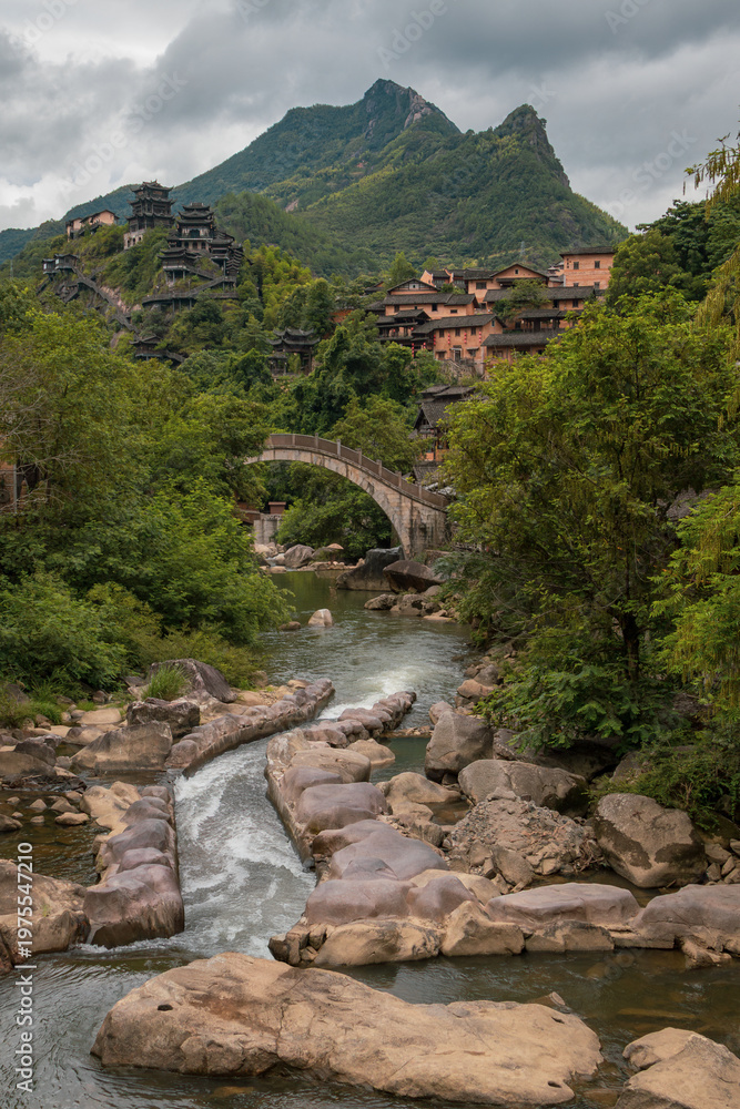 Mountain village along a rocky river gorge in Wangxian Valley, Shangrao, Jiangxi, China #1975547210