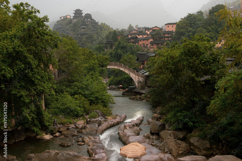 Mountain village along a rocky river gorge in Wangxian Valley, Shangrao, Jiangxi, China #1975547520