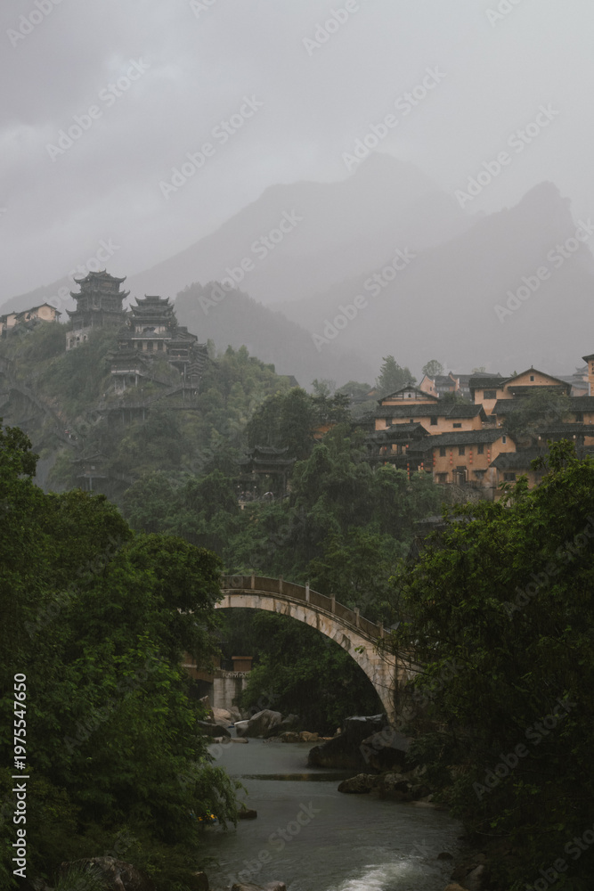 Mountain village along a rocky river gorge in Wangxian Valley, Shangrao, Jiangxi, China #1975547650
