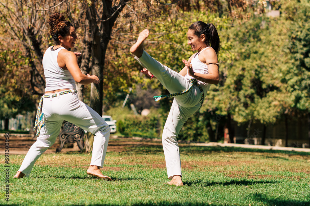 mujeres practicando patadas, ejercicios y capoeira en la ciudad con su ropa de capoeira en un parque verde en un día soleado #591300956